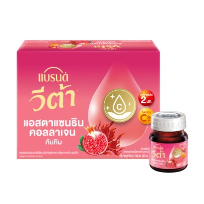 แบรนด์ วีต้า แอสตาแซนธิน คอลลาเจน ทับทิมช็อต ผสานคุณค่าจากแอสตาแซนธิน คอลลาเจน และทับทิม มาเป็นช็อตเข้มข้น อุดมด้วยวิตามิน C สูง มีส่วนช่วยในการสร้างคอลลาเจนเพื่อการทางานตามปกติของผิวหนัง